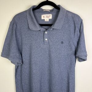 Penguin Original by Munsingwear Heritage slim fit polo t shirt in heathered blue. Collared, short sleeves, two button closure. Made of a cotton blend. Delivers a polished appearance alongside casual comfort. Excellent used condition. Men's size M medium, measurements pictured.