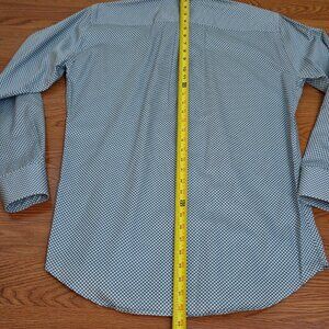 The Peter Millar Men's Black Mint Geometric Diamond Button Down Shirt in size medium is a stylish and versatile piece for any occasion. This shirt features a classic argyle/diamond pattern, long sleeves, button closure, and a collared neckline. The black and mint color combination and geometric diamond design add a touch of sophistication, making it suitable for various events such as travel, weddings, parties, casual wear, formal wear, workwear, and business meetings.