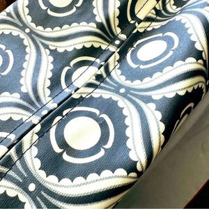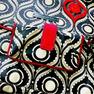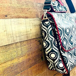 Black/White Moroccan inspired medallions with Crimson and Cayenne hand embroidered detail. Crimson water-resistant lining and Black straps.