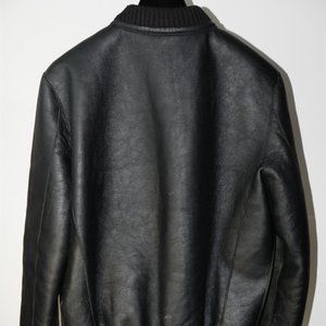 This leather bomber features padded and quilted nylon sleeves. Zipper fastening. Two zipped pockets. Rib knit hems. Inner lining. Faux fur shell