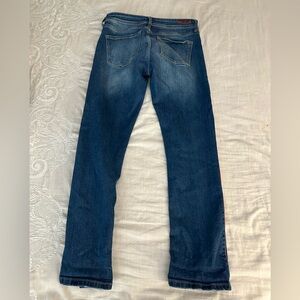 Cropped straight cut jeans with a red stripe. Extremely flattering. Excellent condition