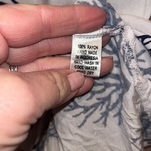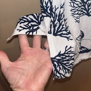 Pit to pit flat back is 22” inches and length shoulder to hem is 29” inches item has gathered waist in back. Slit sides with 3/4 length sleeves. White top with sea shells and coral navy blue print. In preowned condition, freshly washed and air dried . Smoke and pet free home.