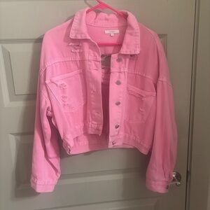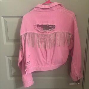 The perfect pink jacket for fall! Bright pink Veveret denim/jean distressed jacket. Size Medium. Super fun rhinestone detail across the back. In great used condition. Small stain on back of collar (see photo).