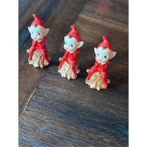 Set of 3 adorable pixie elves/gnomes sitting on tree stumps. Each is handmade and unique from Japan in the 1940s, and capture the charm and nostalgia of Christmas decor from the mid-century. Add a touch of vintage to your Christmas collection, add to a village, create your own Elf on the Shelf game. Excellent vintage condition with minor paint wear; see photos. See pics for measurements.