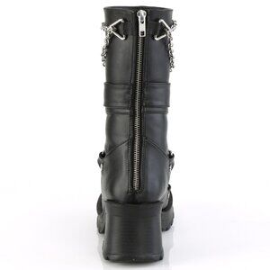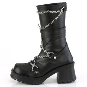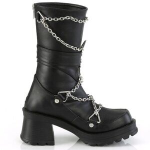2 3/4" Chunky Heel, 1" Platform Gothic Boots. Middle Calf Height. Pyramid Ring, Screw Studs, Hanging Skull O Ring and Metal Chain Detailing. Back Metal Zipper Closure. Faux Leather.