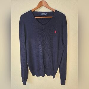Polo Ralph Lauren Mens V-Neck Sweater Size Med 100% Pima Cotton Navy Blue Logo