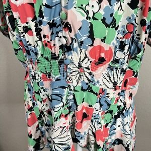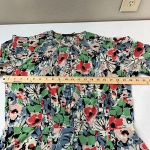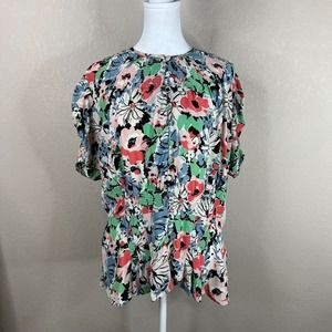 Designed with a feminine peplum silhouette this blouse is accented with thoughtful details like a painterly floral motif crisp pleats and delicate smocking.