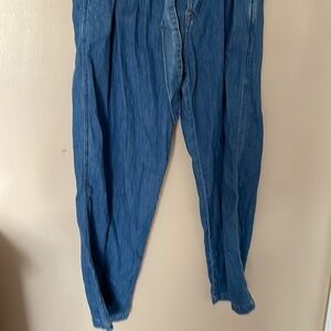 Blue denum (100% Cotton). Pants. Hidden zipper fly with hook-and-bar closure. Pockets. 48" from shoulder to hemline. Inseam: 30". Rise: 14". Leg Opening: 18". Imported.