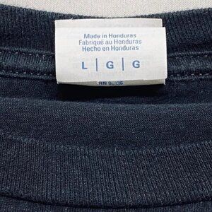 This tee is in good pre-owned condition with no holes or stains and minimal washwear. Please see all photos as this is the exact garment you will receive. Measurements taken with item laying flat- armhole to armhole is 21", length from high point of shoulder to bottom hem is 27". Cotton blend fabric, machine wash cold.