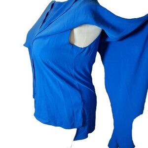 This bold and artistic blouse is by acclaimed designer Prabal Gurung. This electric blue top features an asymmetrical layered design, draped long sleeves, and a sleek button-down front for a dramatic yet wearable statement piece.