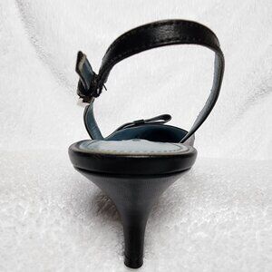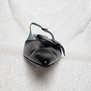 Fashionable and feminine, these Prada leather pointy-toe slingback pumps feature delicate bow accents that add timeless elegance to your look. Crafted in Italy, this pair balances sophistication with everyday wearability, making them perfect for both office chic and evening refinement. On-trend kitten heel leather pumps in must-have black and light-blue logo labeling (based on Prada’s ready-to-wear garment tag). Includes original box and packaging, along with two dust cover bags. Heel height is 2.5 inches. 100% authentic. Used, but still in great condition - see supplemental pictures of individual right shoe and then left shoe.