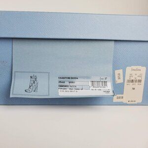 Chic Prada ankle boots with a bold geometric pattern. Features vibrant purple, orange, and brown tones. Perfect for a standout look.