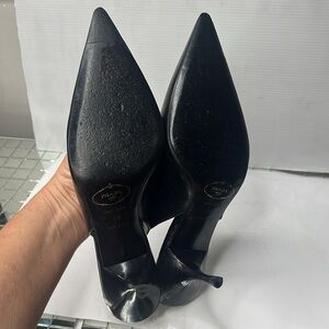 This is a gorgeous pair of Prada Sz 38 Smooth Black Leather Slingback Slip On Classic Heels. 2.5” heels. Pointed toe. The interior leather on the left shoe shows some wear. Otherwise excellent condition. Adjustable sling back strap.