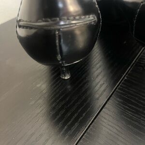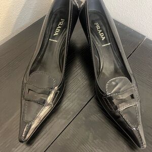 Chic black leather heels by Prada. Minor damage on the right heel with very minor peeling. Otherwise, in great condition!