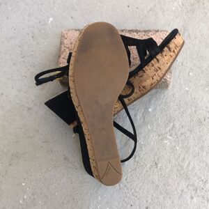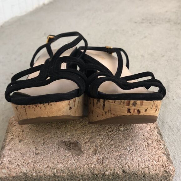 Cute, wedge cork shoe is suede, Check out the pictures. They are in good condition but not perfect. Heel height is 3 inches platform. Height is 1 inch.