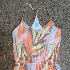 Prana Ayla Athletic Dress Solstice Tropics Small. Pretty, powerful, and perfect for whatever you have planned for the day, our Ayla Dress is here to prove that feminine style can live in perfect harmony with your active lifestyle. On the outside, an eye-catching print combines with a unique binding loop at the center of the back—creating a chic racerback silhouette that's built to withstand the test of trends. And on the inside? Nothing but comfort! Because removable modesty cups and an interior shelf bra with mesh lining and plush elastic mean you're feeling fantastic and staying supported all day long (so you can focus on what really matters). V-neck spaghetti strap dress. Sublimated prints. Elasticized waist. Curved hem. EVERYDAY ESSENTIAL: Stylish, versatile & comfortable. DESIGNED TO FIT: With A Relaxed Fit. RECYCLED: Reduce & Reuse to Respect our