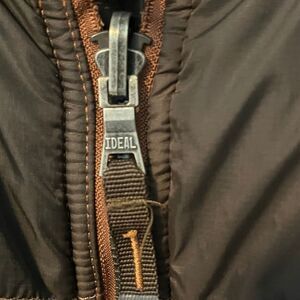 Zip Closure. The brown side has fading bleach mark (see pictures)the plaid side doesn’t have flaws.