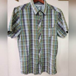 Prana Mens Short Sleeve Snap Front Shirt. Green/blue/gray plaid. Size L