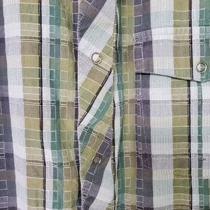 Like new mens Prana plaid shirt. Snap up front. Green, blue and gray plaid. Size L Pit to pit flat lay 21.5" length from collar to hem 28.5" measurements are approximate