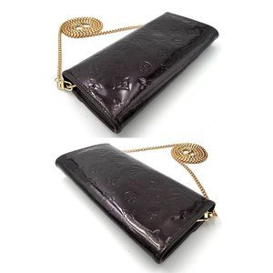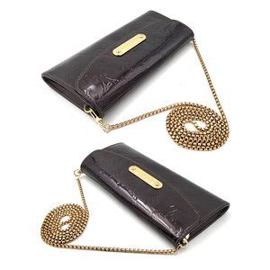 Preowned Louis Vuitton Pochette Sunset Boulevard - code : TH3068 (2008) - Color : Amarante (dark bordeaux / cherry). The clutch is in patent monogram leather tone on tone. Careful ! The small shoulder strap is missing. A long gold metal chain has been added. With this long strap, you can wear the clutch crossbody. Note this long strap is NOT Vuitton.