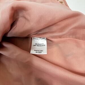 Privacy Please Lehunt Tie Front Sleeveless Floral Print Midi Dress in Ballet has a high neck and back. It closes with a zipper and a button at the back of the neck. The tie at the waist can be in the front or back. The dress is lined.