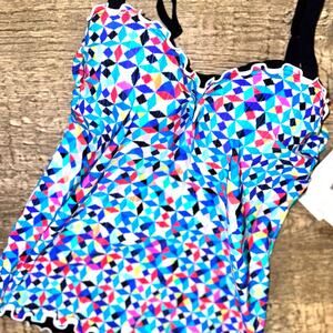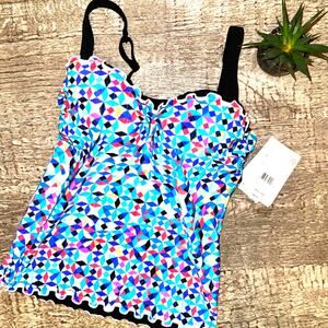 Make a splash in this vibrant Gottex 34D underwire tankini top, featuring a bold geometric mosaic print in a kaleidoscope of electric blues, pinks, and pops of neon. This top combines high fashion with flattering functionality — crafted with supportive molded cups, adjustable straps, and wave-edge trim for a playful touch. It’s equal parts retro and modern, perfect for mixing and matching.