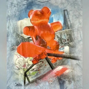 Huge front graphic features a gummy bear skate boarding at. A skate park. Blue paper texture style tie dye. Men’s XL.
