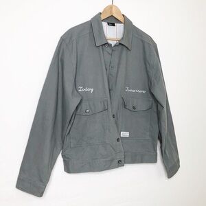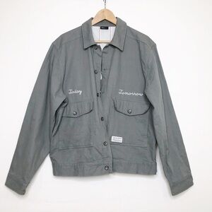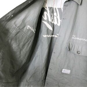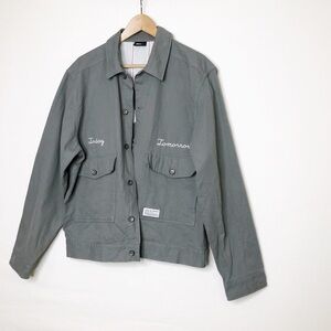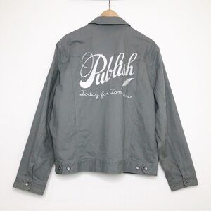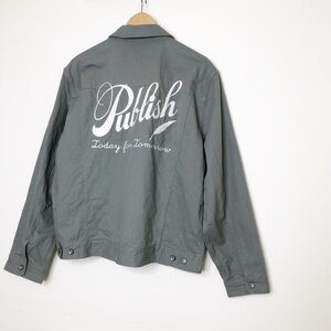 Publish brand unisex olive green jacket with logo printed on the front and back today tomorrow