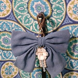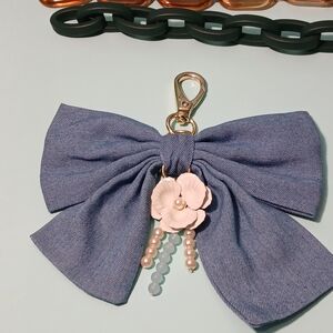 Enhance your style with this elegant purse charm set. Featuring a chic tan bow and a sophisticated blue bow, each adorned with delicate embellishments. Includes versatile dark green and tan chains for a customizable look.