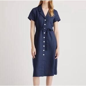 Quince Linen Button Front Short Sleeve Collared Preppy Dress Navy Blue Large