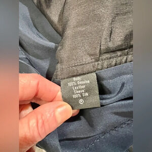 Navy blue silk and black leather panel short sleeve blouse from RAOUL, size XS.