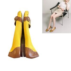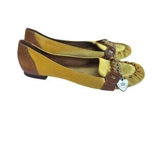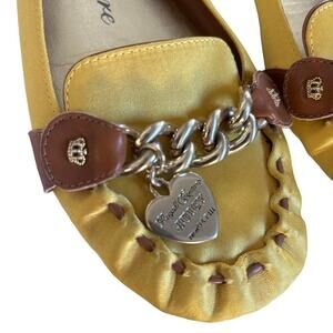 Stunning yellow/golden satin with brown leather trim, thick gold chain link, little heart Juicy couture charms on the front of the foot.