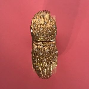 Super Rare, statement bracelet featuring gold wings, white bright clear rhinestone accents on a hinged lucite bracelet.  One of the most iconic bracelets ever from our Queen, Betsey.