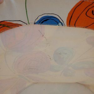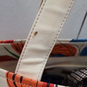 A faint smudge on one of the strap base. You won't be disappointed with this one! Love the vibrant color and the abstract butterfly pattern that almost look floral. Roomy and can hold essentials.