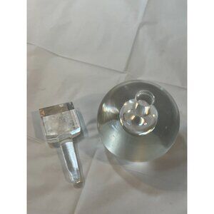 The perfume bottle has a clear glass round bottom & stopper with dabber.