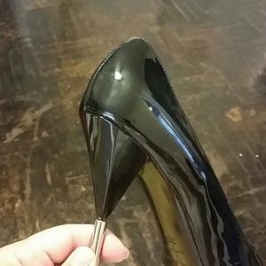 Black patent leatger with funky silver metal heel...worn twice!!! Heel height about 3inches fits like a 9