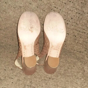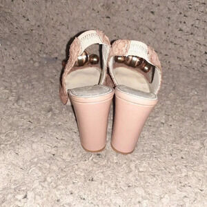 Size 6.5/7, measures 9.75" via insole, 3.25" wide with 3.75" block leather wrapped heel.