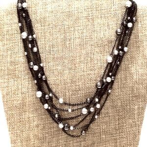 RMN Gunmetal Multi Strand Faux Pearl Station Necklace Signed