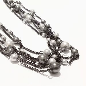 This stunning RMN signed necklace features a bold and elegant multi-strand design. Crafted with six strands of gunmetal finished chains, the necklace is accented with stations of faux pearls in varying shades of gray for a chic and sophisticated look. It measures 18" in length at the shortest strand with an additional 3" extender chain for adjustable wear and fastens securely with a lobster clasp. The RMN signature is found on the attached hang tag. A versatile piece that transitions beautifully from day to evening, this necklace is in excellent condition.