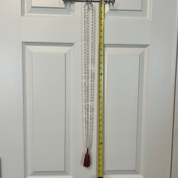 This ROSE QUARTZ Crystal Necklace Mala is a handmade beaded jewelry piece designed with healing properties in mind. The necklace features rose quartz stones, known for their ability to promote love, peace, and tranquility. It embodies the principles of Buddhism and is meant to serve as a spiritual reminder and aid in meditation or prayer practices. Each necklace is hand made so there are some unique uneven spacings. Will make a wonderful bag or phone charm too.