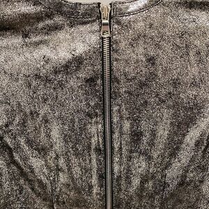 RTA leather silver/black metallic mini dress working diagonal exposed zipper at left side hem, Crewneck, long sleeve with working exposed zipper, exposed back zipper closure. Silverstone hardware and fully lined. Very sparkly!!!