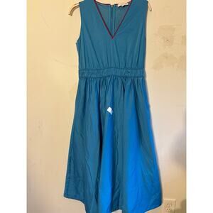 Blue twill (75% Cotton, 22% Nylon, 3% Spandex) Casual dress. V-neck with contrast trim. Sleeveless. Back zipper closure. Midi length. A-line silhouette
