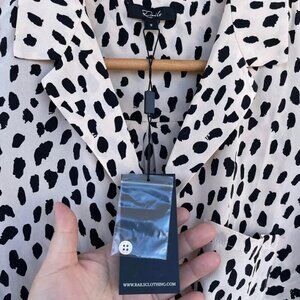 Long sleeve, 100% silk pajama style button-down top featuring a blush colored base with black spotted print and single chest pocket. Elevate your look in luxe silk fabrication while staying on trend with this cute and stylish print.