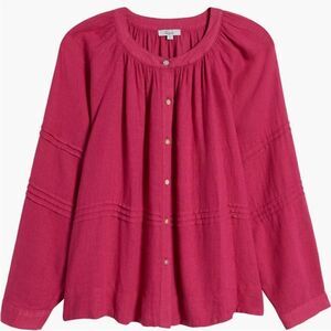 The Frances top is cut from breathable luxe linen and complete with full-length relaxed sleeves. The top features flattering pleating details and buttons down the bodice, and pairs well with jeans, skirts, and more.