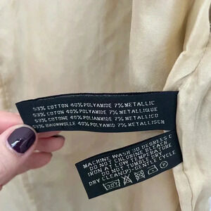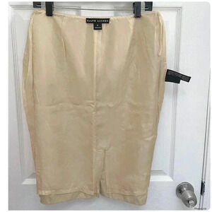 Champagne color pencil skirt by black label Ralph Lauren. Appears to be a crinkle style because I’ve iron (inside outside to protect the material) and it did nothing.