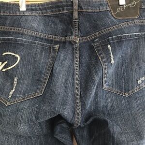 Very rare Ed Hardy jeans with great “love kills” design some distressing. 19" flat across waist, rise 10", inseam 32" straight leg