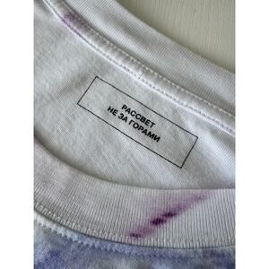 Limited long sleeve T-shirt from Gosha Rubchinskiy’s Rassvet (PACCBET), with painterly paisley print and graffiti-style script. Collectible streetwear essential from a key post-Soviet fashion voice. Made from soft Turkish cotton.