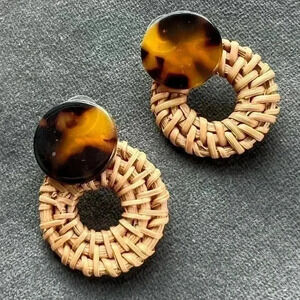Rattan Hoop Dangle Earrings Bohemia Straw Braided Wicker Tortoise Shell