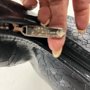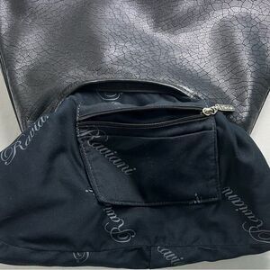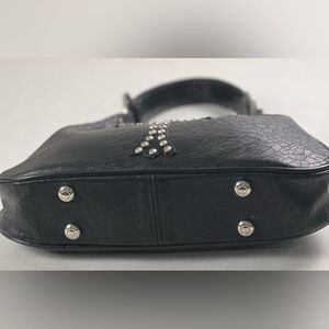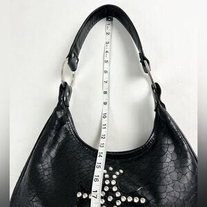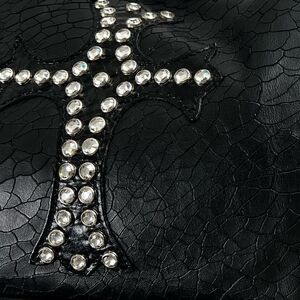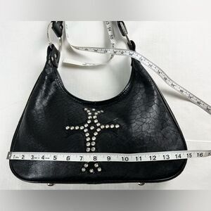 In excellent used condition Raviani black leather shoulder bag with a Swarovski crystal cross. Crystals and rivets along the strap and sides. This bag features top zip closure and inside it has 2 slip pockets and 2 zip pocket.