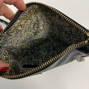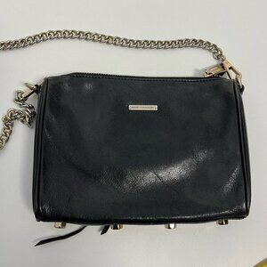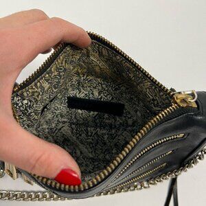 Rebecca Minkoff 4 Zip Cross-body Leather Bag in Black Leather with Silver Hardware. This bag features a zip closure, silver handle/strap, and silver hardware. The lining is made of leather and the exterior is also leather. The accents include zipper and bottom studs. This crossbody bag is perfect for women who want to stay organized while on the go. It has inner dividers, adjustable strap, chain strap, and outer pockets. This Rebecca Minkoff 4 Zip Cross-body Leather Bag is a stylish addition to any outfit.